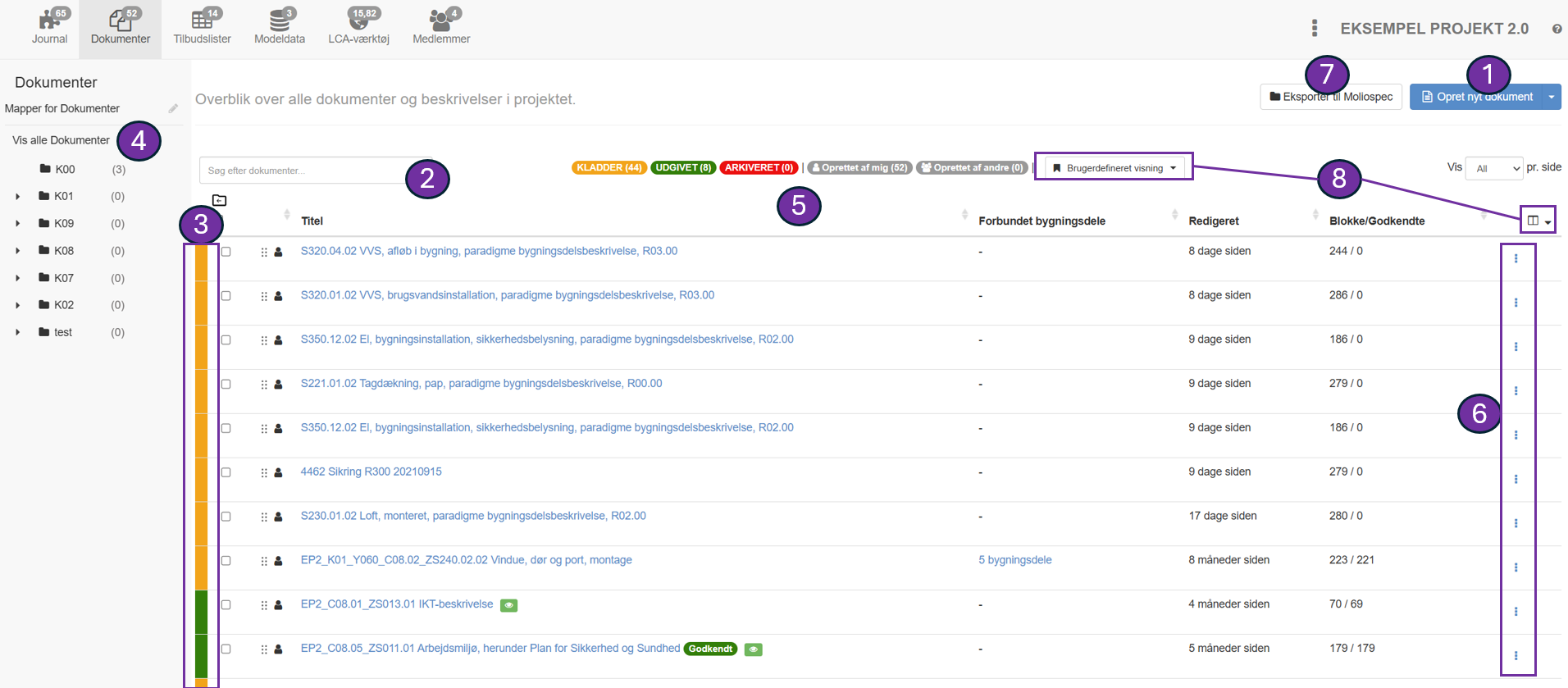 I denne artikel vil du få et samlet overblik over dokumentoversigten under dit projekt. Fra oversigten kan du gøre flere smarte ting, alt sammen for at gøre håndteringen af dine dokumenter nemmere. Alle numre vil individuelt blive uddybet og forklaret under billedet.